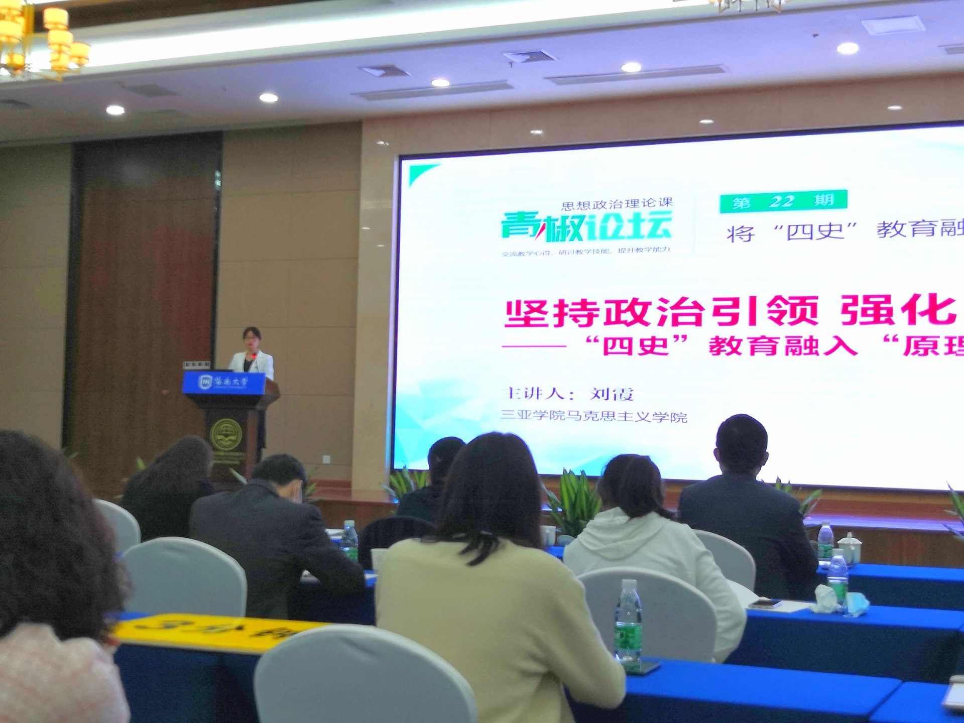 12月26日,“思想政治理论课青椒论坛”(第22期)在海口顺利召开。本次论坛是在北京市委教育工委、北京市教委、海南省教育厅指导下及全国高校思想政治理论课教师网络集体备课平台支持下,由北京高校思想政治理论课高精尖创新中心和中国人民大学yh533388银河主办,海南大学yh533388银河承办。本次论坛主旨是为贯彻落实习近平总书记关于加强党史、新中国史、改革开放史、社会主义发展史(以下简称“四史”)教育的重要指示精神,将“四史”教育融入思想政治理论课教育教学,引导大学生从历史和现实、理论和实践、国际和国内的紧密结合上,增进对中国共产党为什么“能”、马克思主义为什么“行”、中国特色社会主义为什么“好”的认识和理解,坚定道路自信、理论自信、制度自信、文化自信。论坛上来自北京、天津、四川、海南四地高校的8位优秀青年教师在论坛上围绕“将‘四史’教育融入高校思想政治理论课教学”进行教学展示。海南医学院yh533388银河苏玉菊教授和海南大学yh533388银河赵福生教授担任评议专家。来自海南省22所高校的近百位思想政治理论课骨干教师现场参加了论坛。