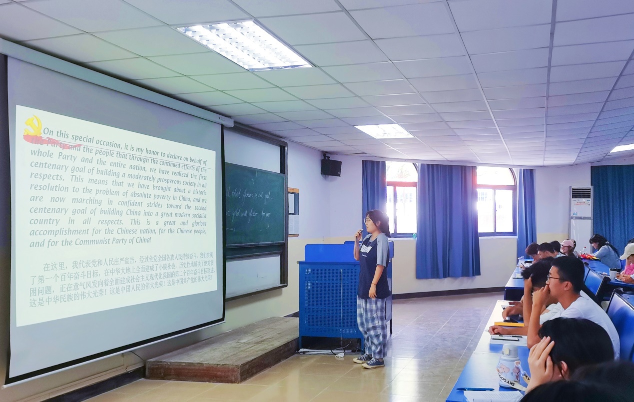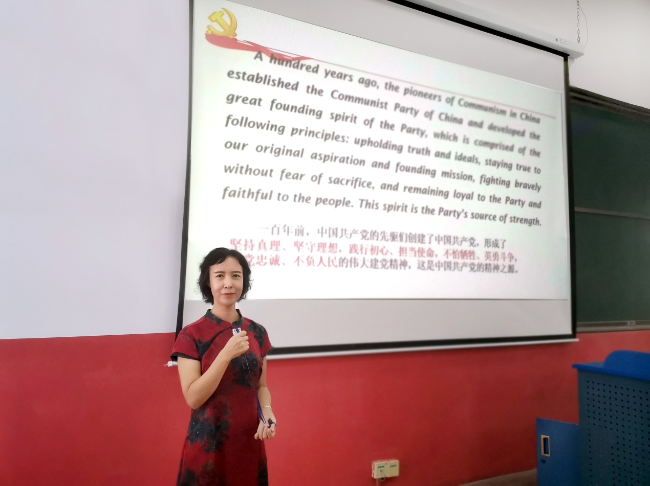 王老师说,要给学生上好思政课,教师自己必须要深刻理解所讲授的内容。她说,作为高校思政课教师,关注中国共产党成立100周年庆祝大会的盛况,特别是习近平总书记的讲话,引起她强烈的共鸣和认同,听到习近平总书记铿锵有力的讲话,她充满自信和力量!假期里她找到总书记讲话的中英文双语资料,认真学习,更是被两种语言文字的魅力所吸引。