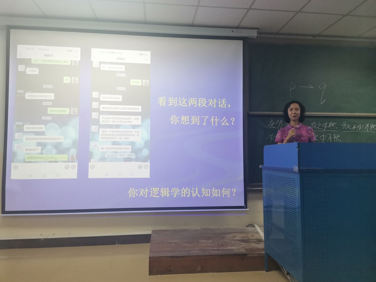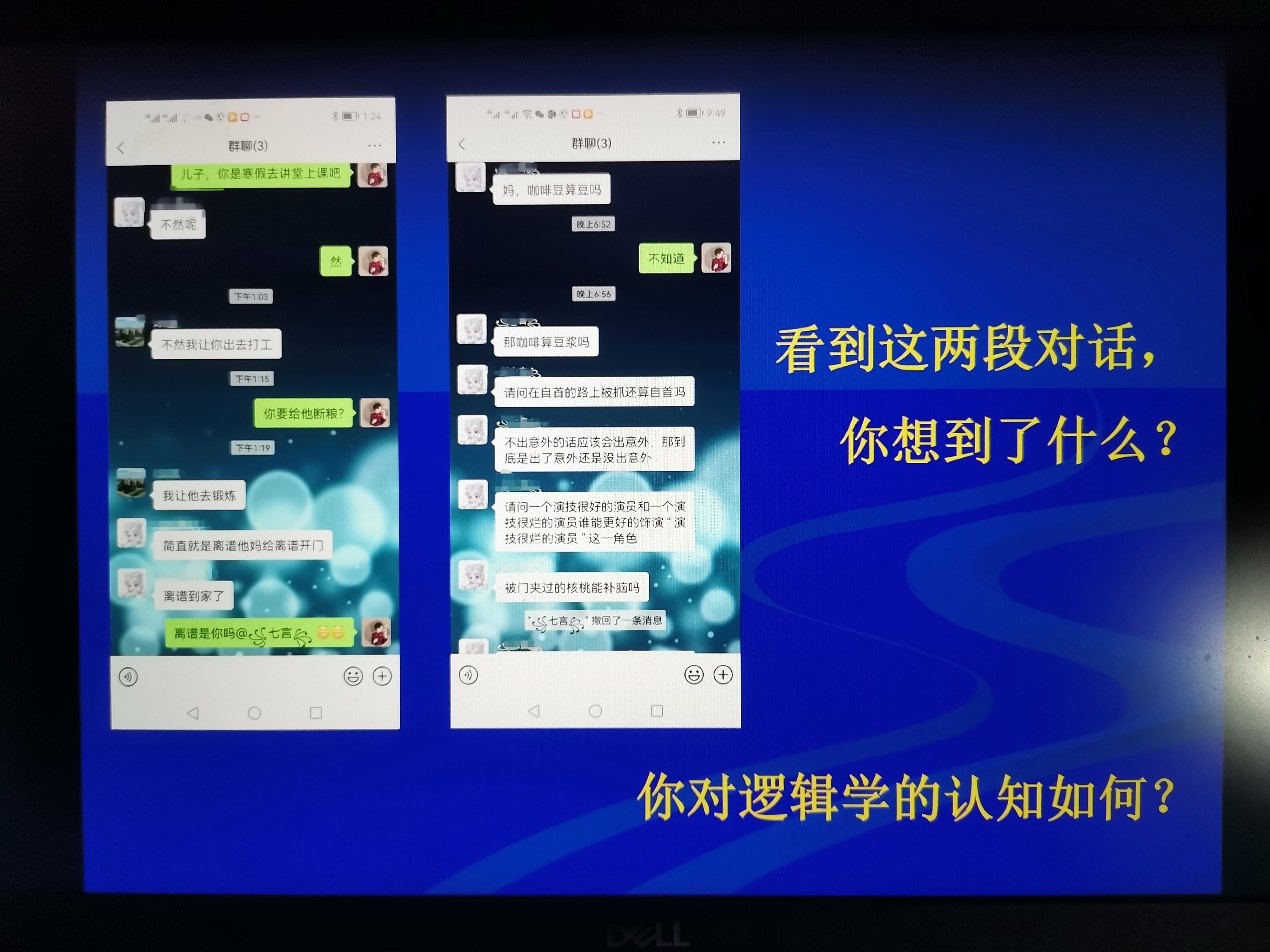 在课堂上,就微信里的两段对话,王老师谈到自己想到的和逻辑学相关的两个问题:
