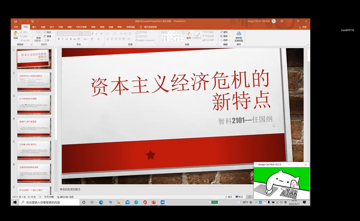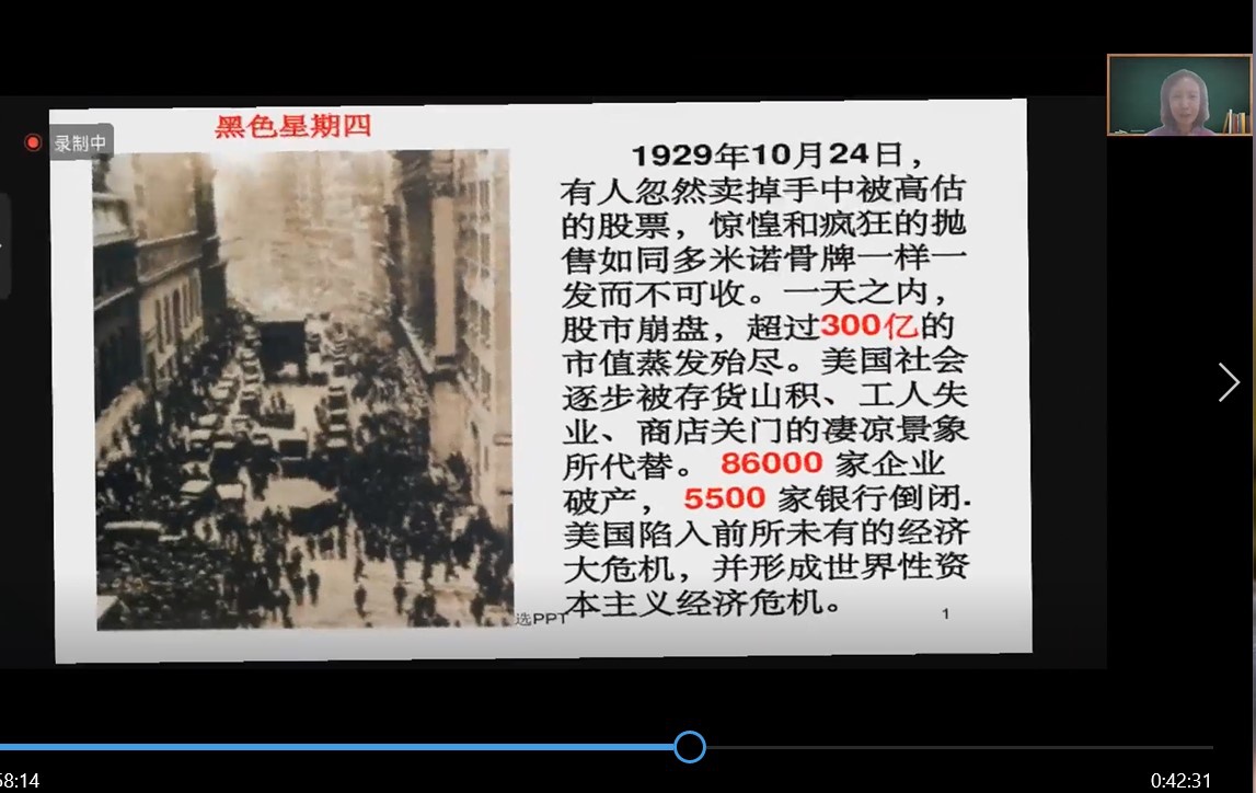 汪圣钦同学讲的是1922年到1933年的资本主义经济大萧条。他说,看其他同学做PPT都是关于当代资本主义经济危机,他想换个话题。我说,好的,不管从哪个角度讲,都是大家一起学习一起收获的过程。
