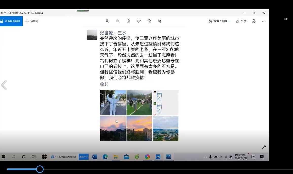 在这场没有硝烟的战争中,作为一名普通老师课堂就是我的阵地,我和学生们一起坚守“阵地“。课堂上,我引用了一个学生(张世淼)微信里的一段话:”突然袭来的疫情,使三亚这座美丽的城市按下了暂停键,从未想过疫情能离我们这么近,年近五十的老爸,在三亚30℃的天气下,毅然决然地去一线当了志愿者,给我树立了榜样!我和其他班委也坚守在自己的岗位上,这里面有太多的不容易。但我坚信我们终将胜利!“上课前我早已把这段微信转发到了我的朋友圈。有学生留言:“赌这段微信会不会出现在通识课的大屏幕上。”我回复:“何止是通识课,这是三亚学院的亮点。”学生对我的风格已有所了解。