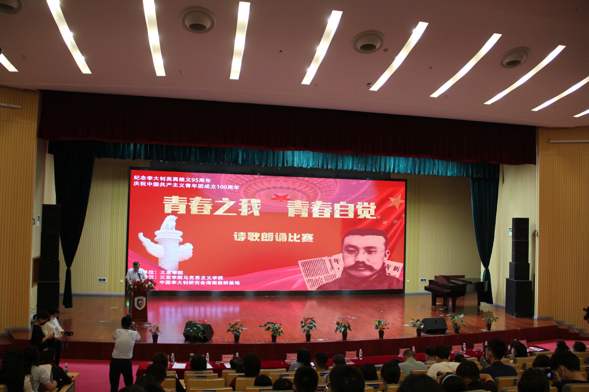 春风已解千层雪,后辈难忘先烈恩。为纪念李大钊英勇就义95周年,庆祝中国共产主义青年团成立100周年,5月4日下午,由三亚学院主办,yh533388银河和中国李大钊研究会海南教研基地承办的“青春之我 青春自觉”诗歌朗诵比赛在三亚学院书山馆举行。本次活动旨在铭记革命先烈,传承红色基因,展现青年风采,凝心聚力迎接党的二十大召开。