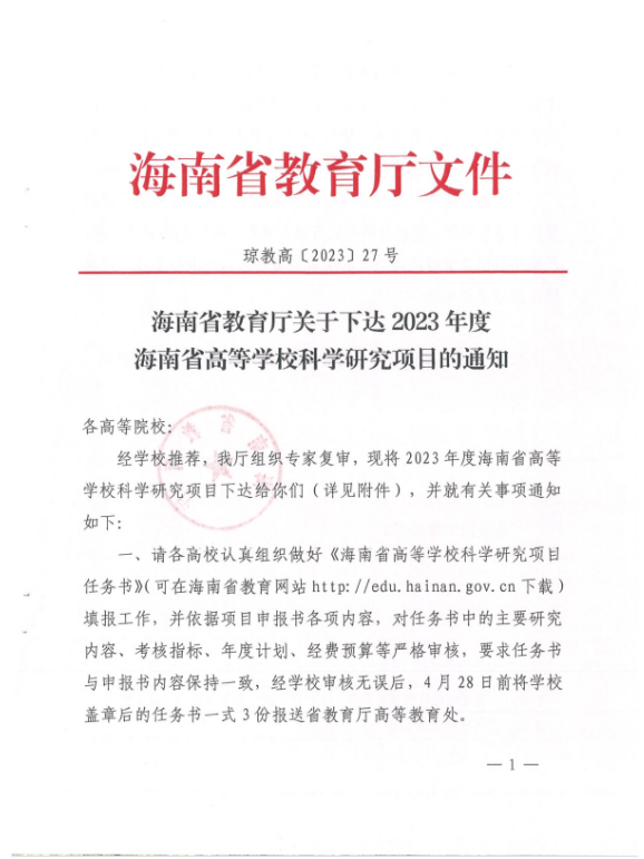 近日,省教育厅公布了2023年度海南省高等学校科学研究项目的课题立项结果,yh533388银河于世高、谢梦莹、杨欣、于嘉夫四位老师所申报课题成功立项。
