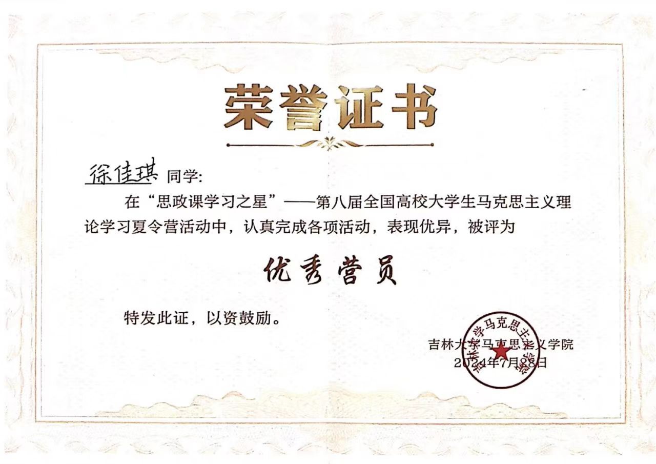 徐佳琪同学获得第八届全国高校大学生马克思主义理论学习夏令营优秀营员荣誉称号