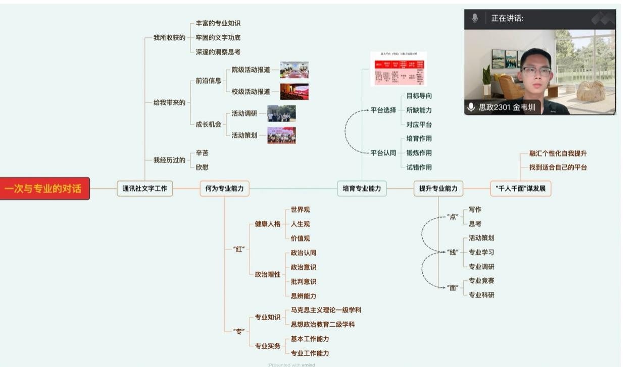 “依托平台走进专业、提升能力的方法论最终要落回‘千人千面’办学理念的落地转化,本次分享的内容有个性的感受,也有共性的经验,只有从中找到适合自身的提升方法、方向,并付诸实践,才能集聚成长成才的最大势能”金韦圳同学在总结时谈到。
