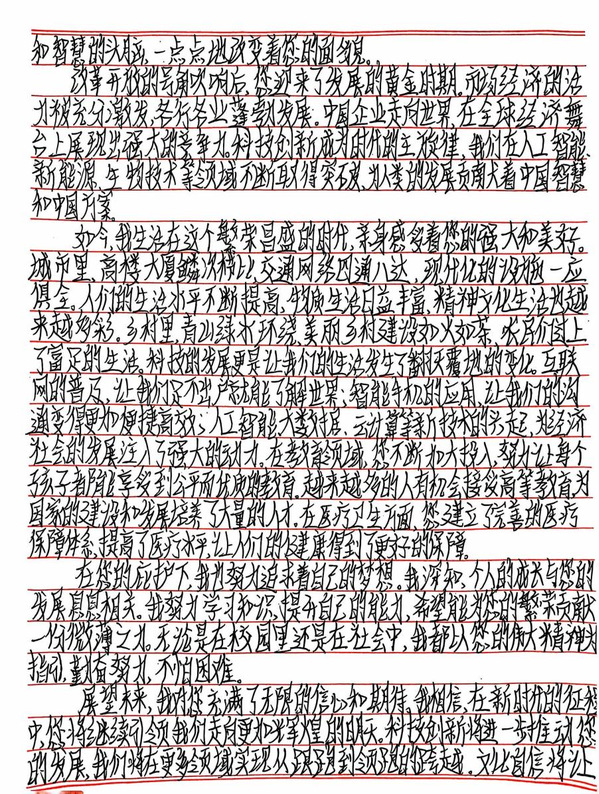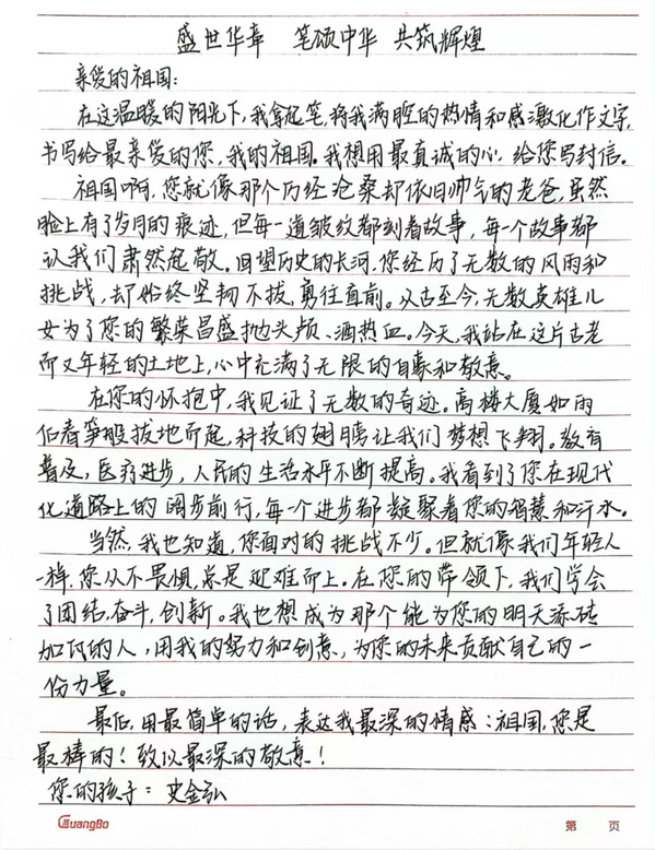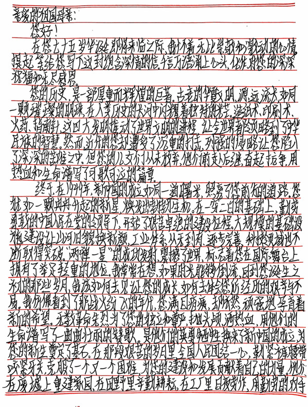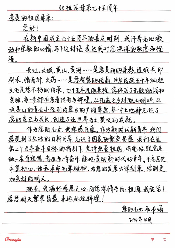 墨香映初心,书写爱国情。为热烈庆祝我们祖国母亲的第七十五个生辰,yh533388银河学生会举办“青春诗笺,告白祖国”系列活动。第二期我们展示的是“小马们”投稿的手写信,他们用传统而深情的文体,抒发自己对祖国的热爱之情,同时展现了我国文化的深厚底蕴和独特魅力。下面让我们一起看看“小马们”的作品吧。