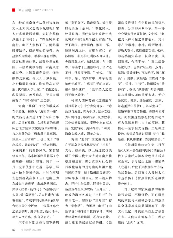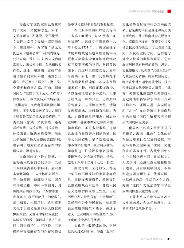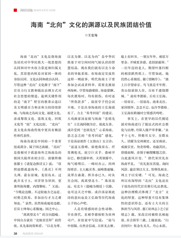 《海南“北向”文化的渊源与民族团结价值》是《海南政协》本期刊发的惟一的学术研究文章,也是本期篇幅最长的文章,突破了该刊单篇发文不超过3000字的常规。