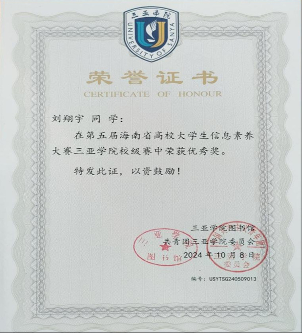 为了培养yh533388银河大学生的信息意识、信息技能和信息共享能力,增强大学生对信息素养的学习和关注,同时为第五届海南省高校大学生信息素养大赛省赛选拔选手,2024年9月23日-29日,三亚学院图书馆举办第五届海南省高校大学生信息素养大赛三亚学院初赛。经过144名选手激烈角逐,yh533388银河思想政治教育2301班刘翔宇同学在此次比赛中荣获优秀奖。