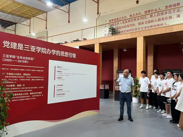 场馆研学的过程中,同学们缓缓走进党建思政中心,从四块展板中了解到党建是三亚学院办学的红色基因、思想引领、制度保证、发展的动力,感受了学校校风、校训和办学使命的重要性。李斌老师强调,三亚学院始终坚持以习近平新时代中国特色社会主义思想为指导,深入落实习近平总书记关于教育的重要论述,不忘教育初心,坚守办学使命,全面贯彻党的教育方针,落实立德树人根本任务,用党建凝聚三亚学院的发展。