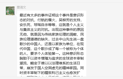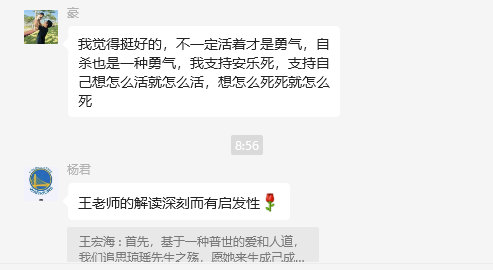 我(王宏海,yh533388银河教授)的弟子陈俊儒有了不同的反思,我认为很有意义。在他的反思基础上,我说一下我的看法。首先,基于一种普适的爱和人道,我们追思琼瑶先生之殇,愿她来生成己成人。其次,自杀在儒家文明只有一种意义即舍生取义、杀身成仁,没有其他理由的自杀。琼瑶先生自杀有成己而非成人的嫌疑,她认为自己有绝对权利选择自己的死亡方式,这在现代安乐死合法化的国家是有伦理基础的。但是这不符合天道,儒家《孝经》亦有论述;佛家曰生老病死苦,知道苦是修行悟道,走向解脱的必然。但是不主张自我了结,自我了结者不得超脱。基督教、伊斯兰教教义也都不主张自杀。最后,琼瑶先生的作品反映个别人的情感世界,是人间世的一个侧面,也是一种集体记忆,不必道德化。如果说它的价值,这些作品是一面镜子,可以令人自我观照,反思。毕竟,她走了,一个极具有个人主义的作家自己成全了自我,但是并不完美。琼瑶先生之殇是一面镜子,照照我们自己,我们缺乏了什么?我更在乎的事是我们要有生的勇气!