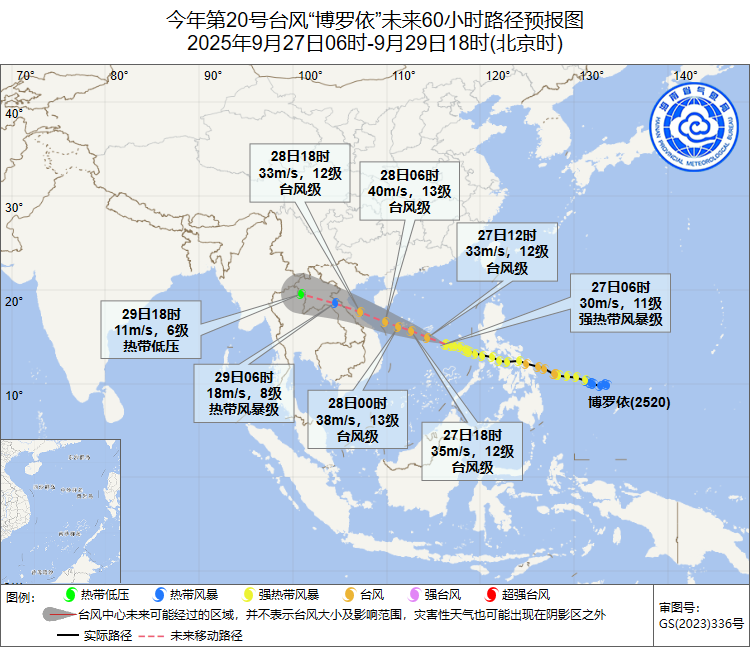 根据气象预报,今年第20号台风“博罗依”(强热带风暴级),27日6时中心位于北纬14.2度、东经116.2度,也就是距离海南省三沙市永兴岛东南方向的505公里的南海东部海域上,中心附近最大风力11级(30米/秒),十级风圈半径100~120公里。预计,“博罗依”将以每小时35公里左右的速度向西偏北方向快速移动,强度逐渐增强,27日夜间趋近西沙群岛至海南岛南部海面,最大强度可达强台风级。
